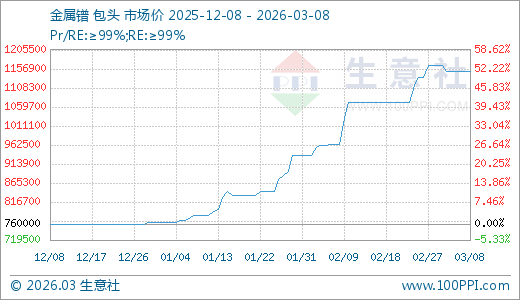 03月08日金属镨1150000.00万元/吨 15天上涨7.48%